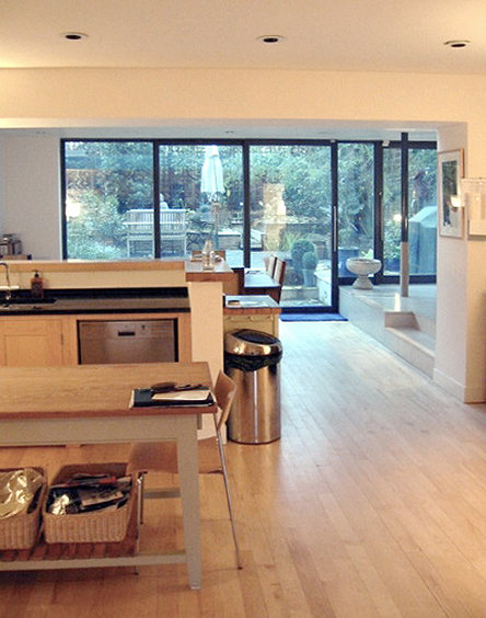 A town house extension and total refurbishment. The ground floor extension has a   frameless glazed extension overlooking a terrace giving light to the crafted   ziz-zag staircase whcih gives access to the lower ground floor. The project   included a landscaped garden and a contemporary loft conversion. Clarke Kidwell Architects project John Clarke Partner in charge    |