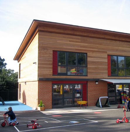 8 New Classrooms were built to replace temporary classrooms. A low energy timber frame construction was used for speed of construction. The building has a copper roof for RW harvesting. The ground floors all have direct access to external play space. Coloured louvers create a playful yet functional exterior.