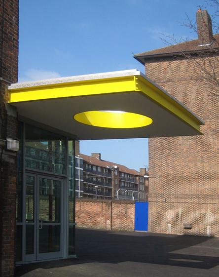 The coloured louvered window panels give each class its own identity as well as giving much improved natural ventilation. At the rear of the school is a new swimming pool and new three storey class room block. The project is due for completion in 2011; the school is one of London’s first Academy Primary School